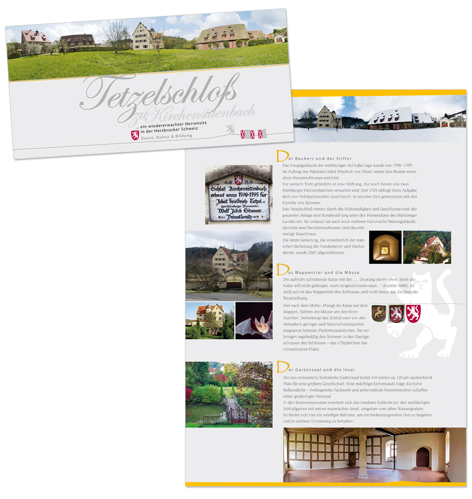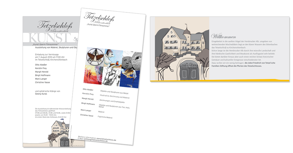 Unsere Leistungen: Logo und Geschäftsausstattung, 6seitiges Faltblatt, Grafische Ausstattung für den jährlich stattfindenden Filmsommer im Schloßpark, Einladungskarte zur Ausstellung "Kunst überm Filmsommer".